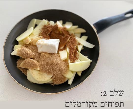תפוחים מקורמלים: ממיסים במחבת גדולה את חמאת הנטורינה, מוסיפים סוכר, קינמון ותפוחים ומבשלים על להבה בינונית עד שהתפוחים מתרככים והנוזלים מצטמצמים. מעבירים למסננת להגרת נוזלים נוספים. מניחים את התפוחים מעל הקלתית ומעבירים למקרר למשך 20 דקות.