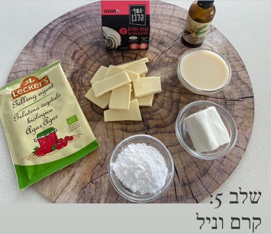 קרם וניל: משרים אגר אגר במעט מים רגילים ומשאירים לנוח כרבע שעה. מעבירים לסיר קטן ומבשלים אגר אגר על להבה קטנה וכל הזמן בוחשים עד שהוא נמס לגמרי. ממיסים על בן מארי (קערה מעל סיר עם מים) את השוקולד הלבן עם משקה הסויה, עד לקבלת תערובת חלקה. מוסיפים את האגר אגר לתוך תערובת השוקולד הלבן. מוסיפים חמאת נטורינה רכה, מלח ותמצית ווניל ומערבבים עד לאחידות. מצננים.
