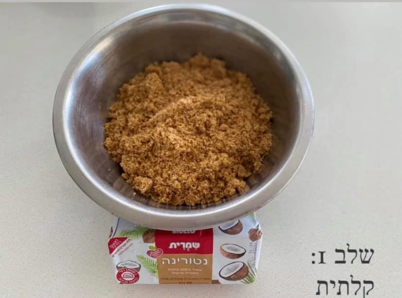 קלתית: טוחנים במעבד מזון את הביסקווטים, מוסיפים חמאת נטורינה מומסת ומערבבים עד לקבלת פירורים. יוצרים קלתית בתוך התבנית, מהדקים היטב בשכבה דקה ואחידה את התערובת.